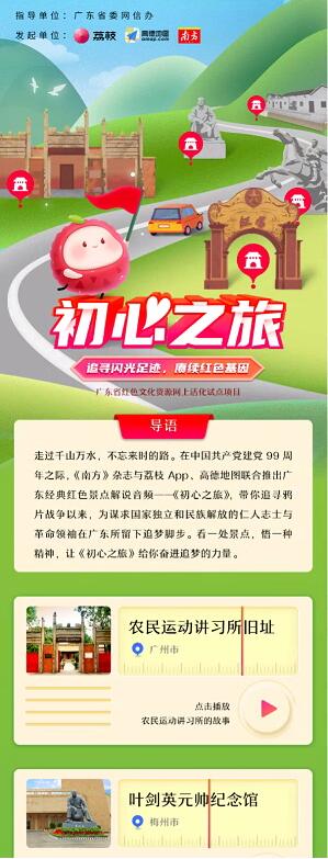 為充分滿足網(wǎng)絡(luò)用戶對紅色旅游的資訊需求,國內(nèi)最大UGC音頻社區(qū)荔枝App聯(lián)合廣東省委機關(guān)刊《南方》雜志推出《初心之旅》紅色景區(qū)解說音頻,由網(wǎng)絡(luò)主播講解革命領(lǐng)袖在廣東的追夢故事,依托國內(nèi)領(lǐng)先出行平臺高德地圖優(yōu)勢共同打造紅色語音地圖。